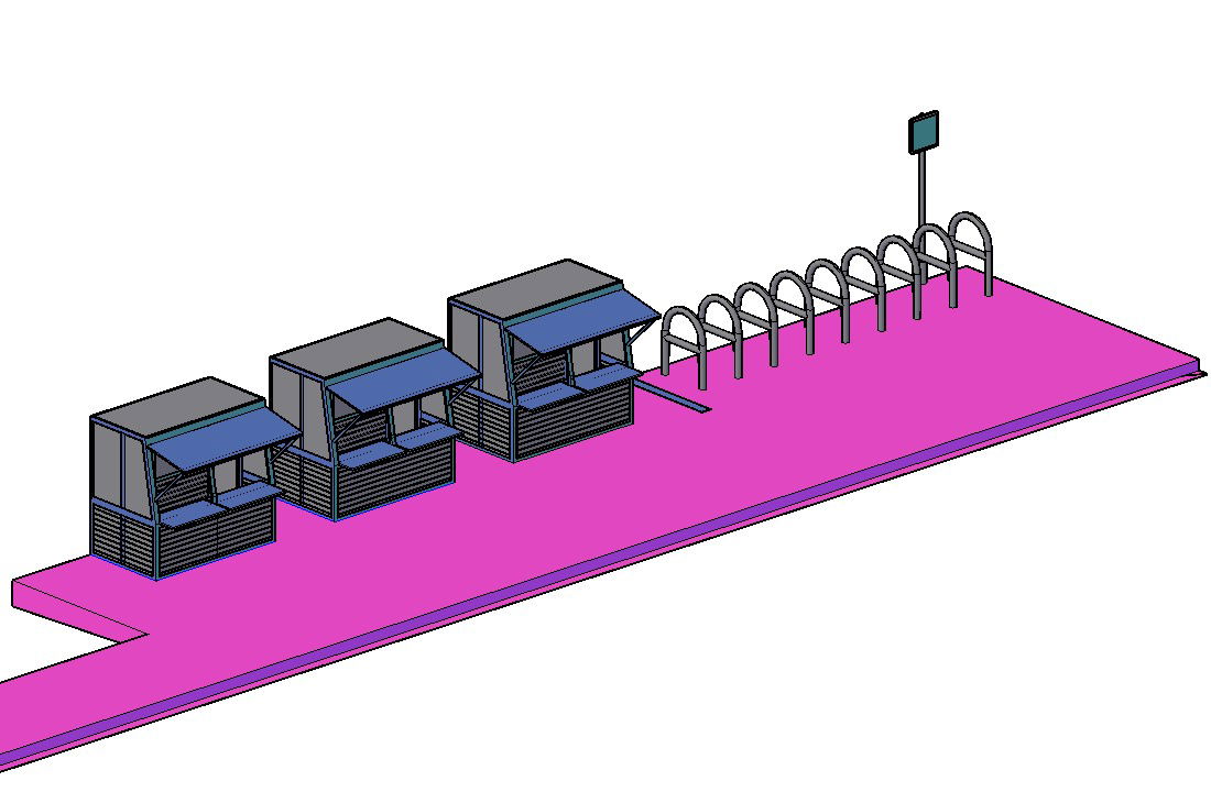 Bicycle Parking For 3D Model With AutoCAD File.this bicycle parking area and three shop Isometric design For Drawing.the are bicycle parking download file