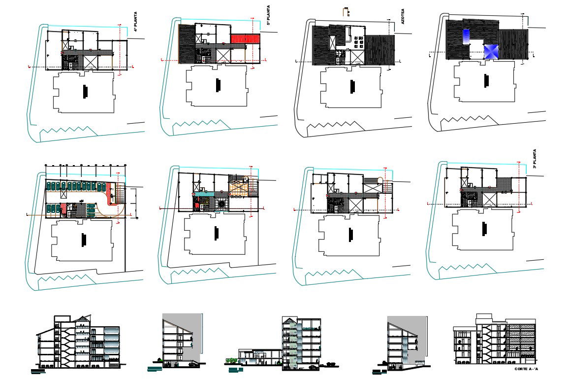 Office building Project With DWG File.This shows five Floor plan Existing Construction Area ,Car Parking, Pasco Regional Expansion Of Government, National University Hermilio Valdizan, Architecture, Cuts