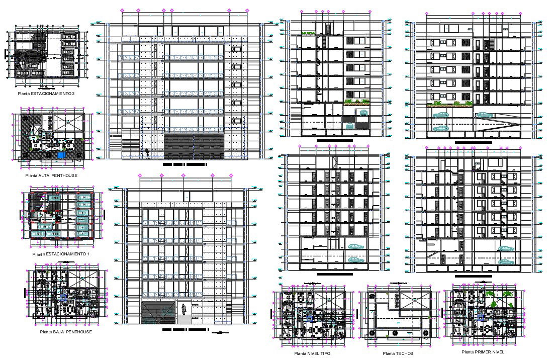 Apartment Building Project With DWG File.this provide in Floor layout plan Include master bed room,two bedroom attache toilet,kitchen for in plan with Basement Plan in parking area, and four side section, elevation in two side With dimension detail download file,