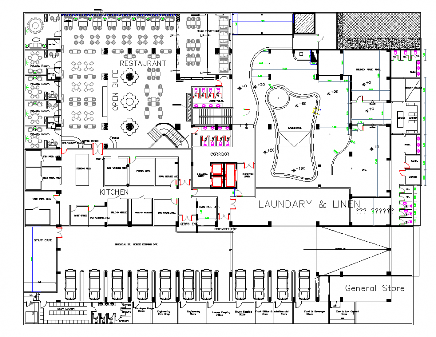 Laundry and lines planning autocad file, dimension detail, naming detail, furniture detail in door and window detail furniture detail in door, window, sofa, and cub board detail, brick wall detail, leveling detail, car parking detail, swimming pool detail, not to scale detail, etc.