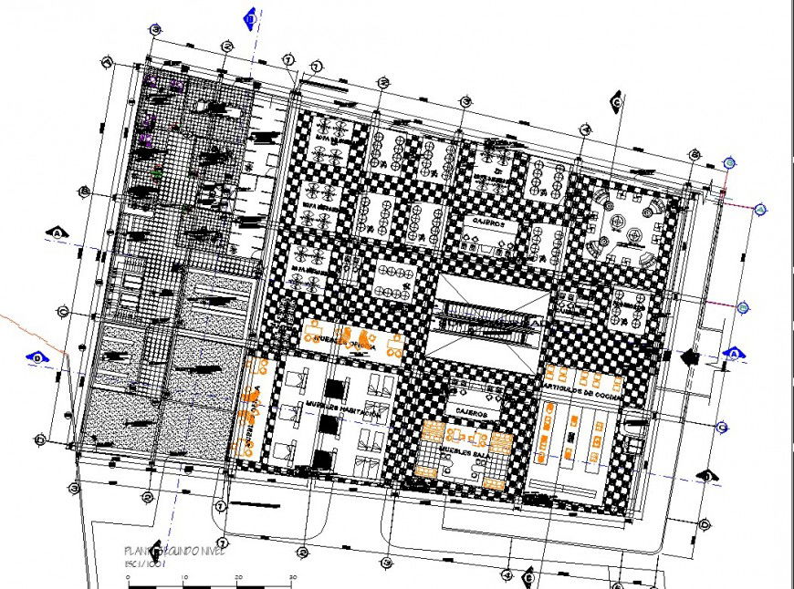 Hostel commercial building planning autocad file, centre line plan detail, dimension detail, naming detail, section line detail, flooring tiles detail, brick wall detail, stair detail, car parking detail, not to scale detail, furniture detail in table, chair, door, window, sofa, table and bed detail, etc.