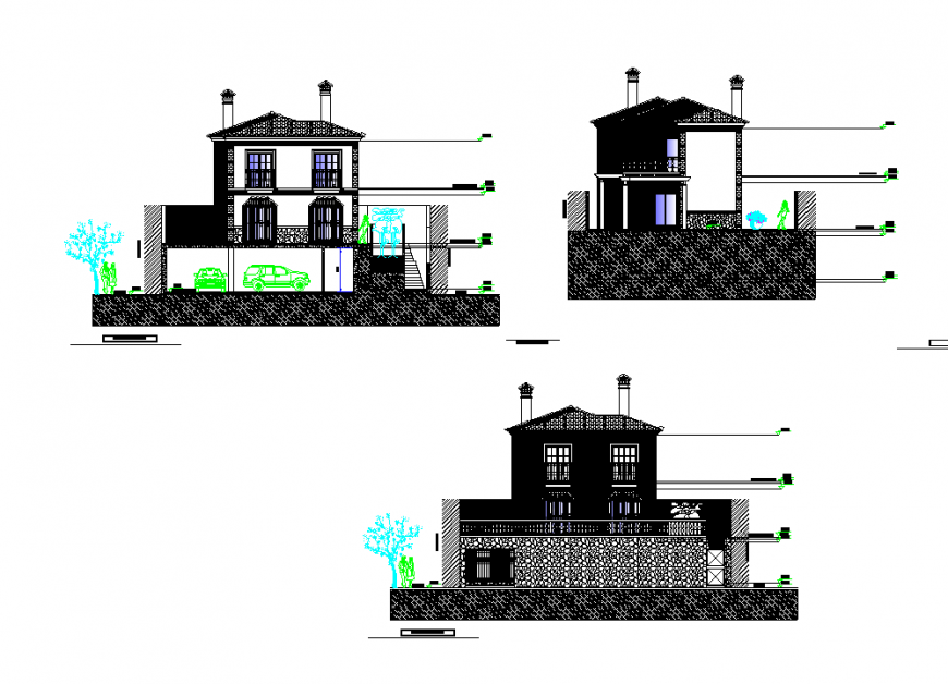 Elevation living place planning autocad file, dimension detail, naming detail, front elevation detail, side elevation detail, back elevation detail, leveling detail, landscaping detail in tree and plant detail, people detail, car parking detail, furniture detail in door and window detail, not to scale detail, stone detail, hatching detail, etc.