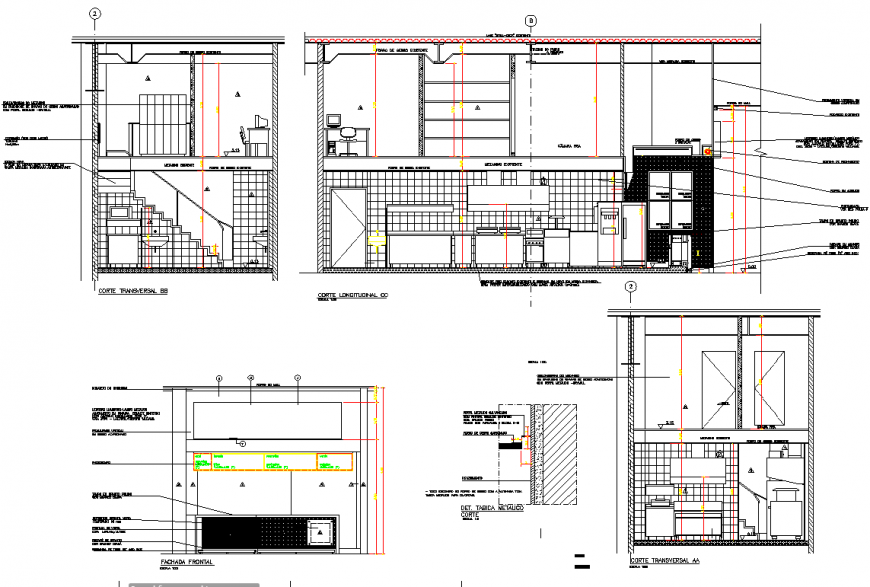 Elevation and section kitchen layout file, section A-A’ detail, section B-B’ detail, section C-C’ detail, front elevation detail, centre line detail, dimension detail, naming detail, stair section detail, hatching detail, stair section detail, handrail detail, hatching detail, etc.