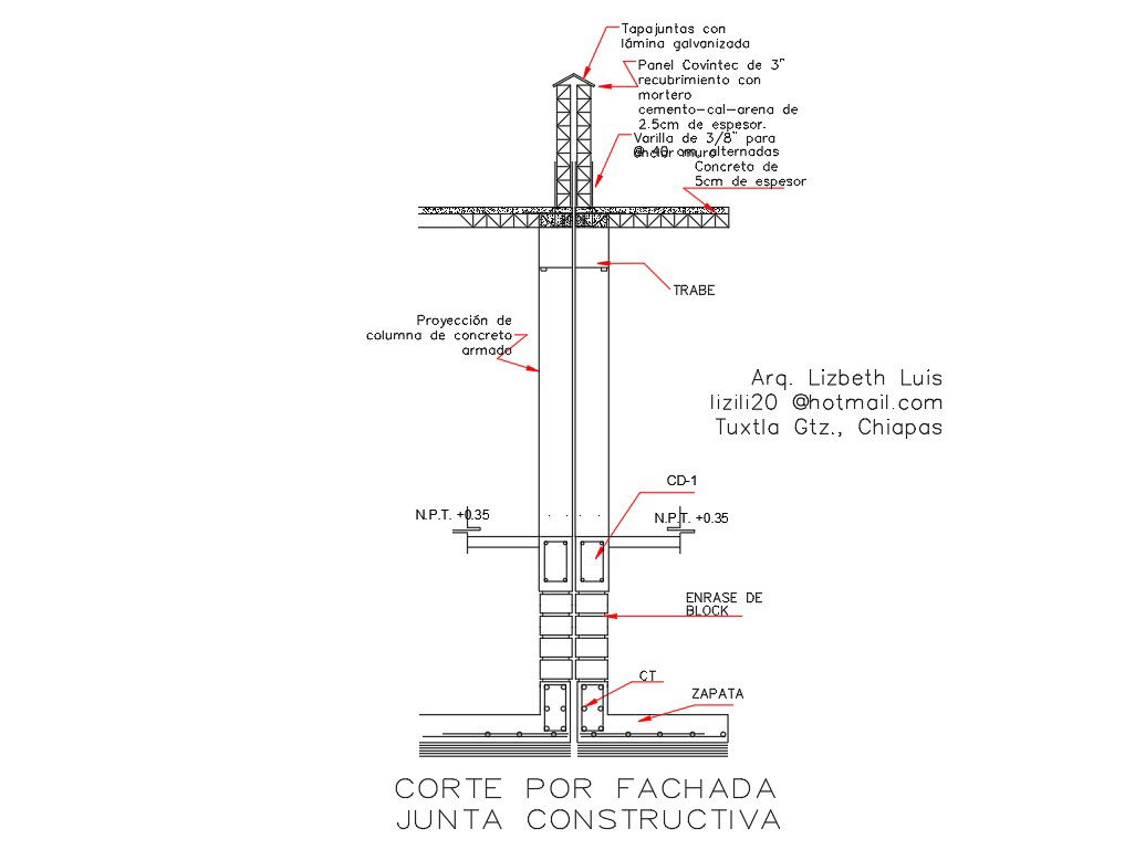 A Section plan Flashing with galvanized sheet, Covintec Panel 3 " coated with mortar cement-lime - sand 2.5cm thick, Projecting reinforced concrete column. Section plan