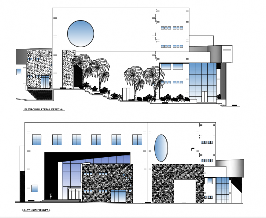 Big Auditorium Elevation design dwg file. This Right elevation detail,, side elevation detail, glass window detail, glass door detail, tree elevation detail etc in autocad format.