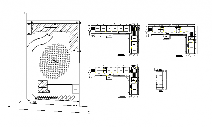 School planning layout file, dimension detail, naming detail, car parking detail, hatching detail, not to scale detail, not to scale detail, landscaping detail in tree and plant detail, brick wall detail, cut out detail, hidden line detail, top elevation detail, etc.