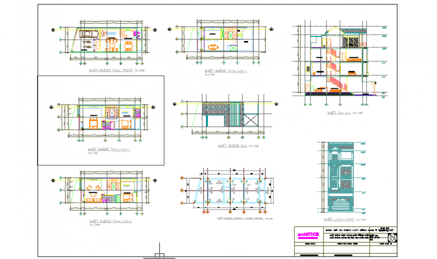 Here the Architectural Small classical house design drawing with ground ,first and second floor layout design, working layout design and furniture layout design , front elevation design and section design with stair case detailing in this auto cad file.