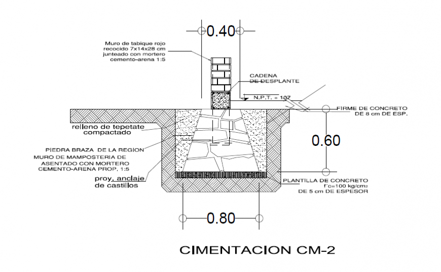 Foundation construction detail section layout file, dimension detail, naming detail, brick wall detail, specification detail, stone detail, soil detail, hatching detail, concrete mortar detail, leveling detail, water cement ratio 1:5 detail, thickness detail, not to scale detail, etc.