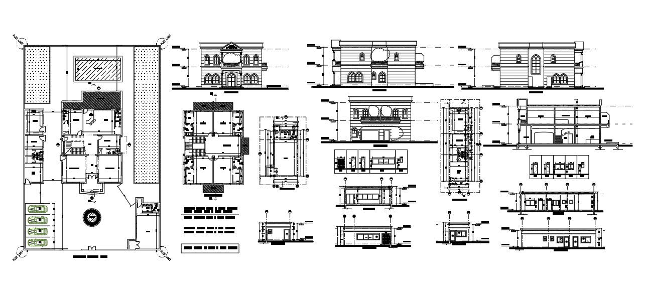 Modern villa details provide in ground floor, first floor details , section plan, elevation details,, GUEST ROOM, KITCHEN, parking area, garden, etc, Modern villa details