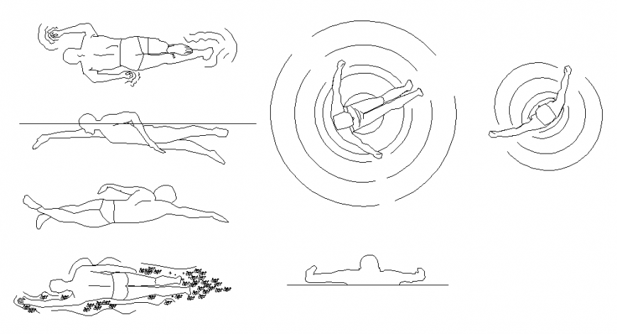 Swimming people bath planning layout file, different poses detail, people detail, cloth detail, not to scale detail, men detail, water level detail, etc.