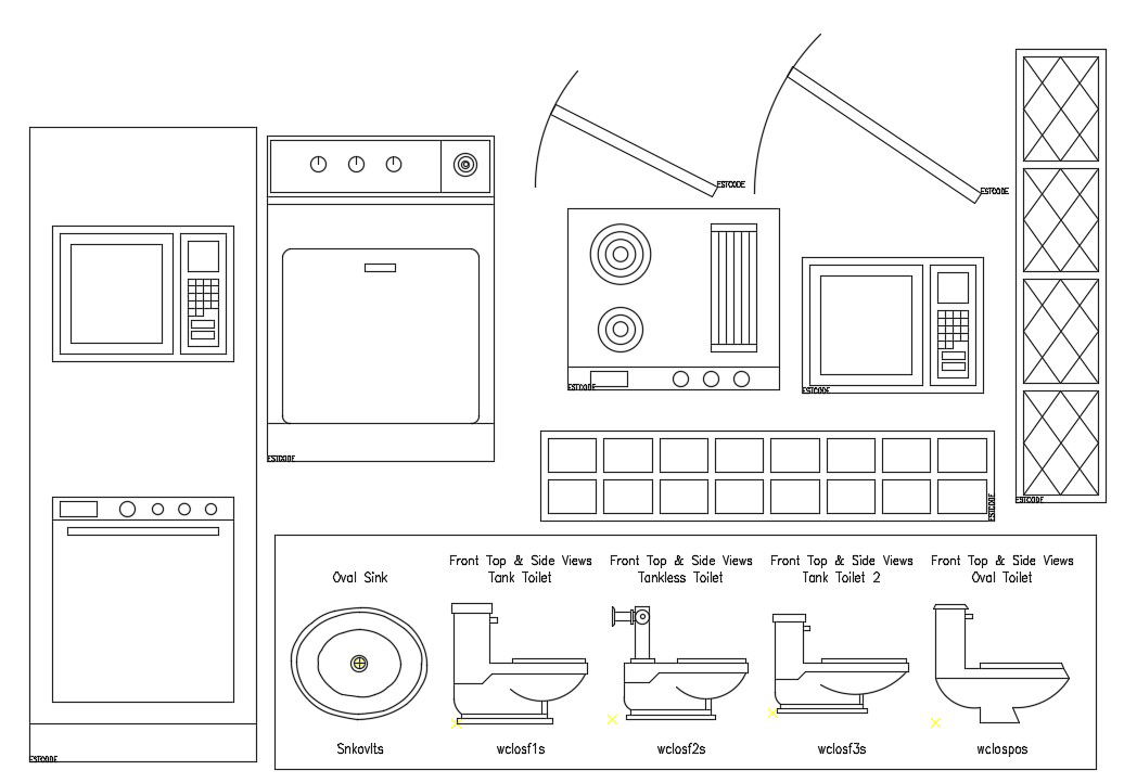 Autocad Block details inclusion a Front Top & Side Views Tank Toilet, T.V , Oven , etc. Autocad block details download file, Autocad block details dwg file, Autocad block