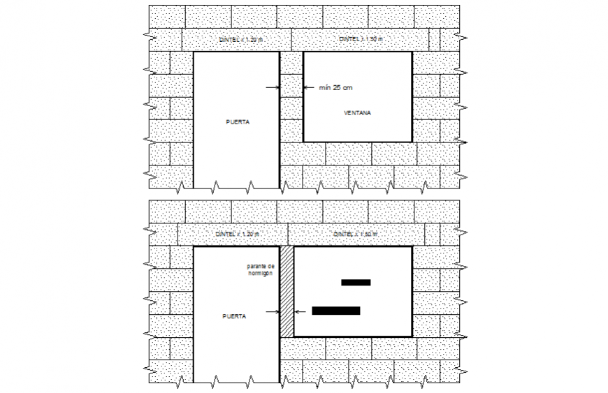 Wall front elevation autocad file, naming detail, brick wall detail, furniture detail in door and window detail, cut out detail, hatching detail, concrete mortar detail, English bond detail, not to scale detail, thickness detail, etc.