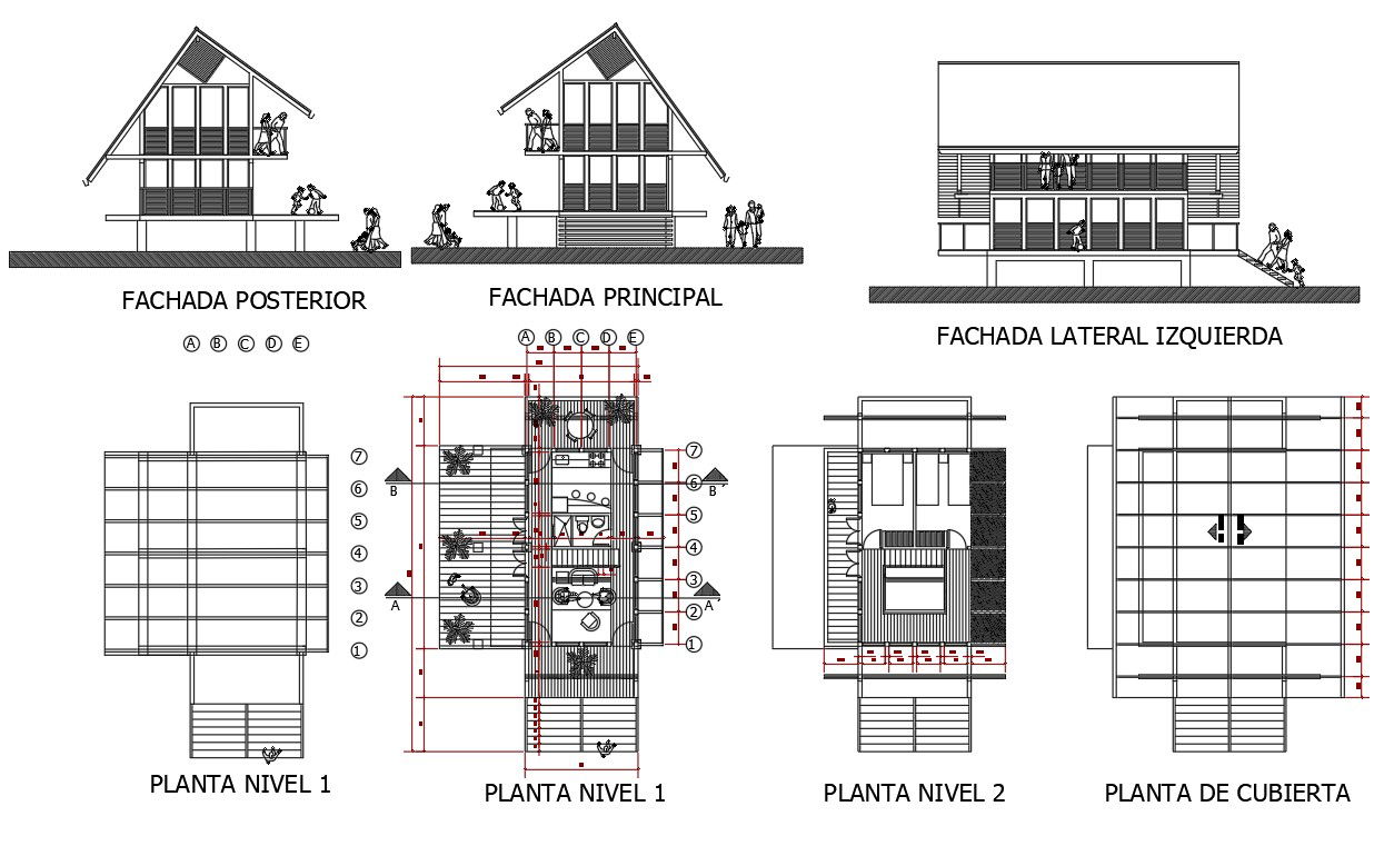 House project details including a layout plan , elevation details, FRONT LEFT SIDE, bedroom, kitchen, furniture design, House project download file, House project dwg