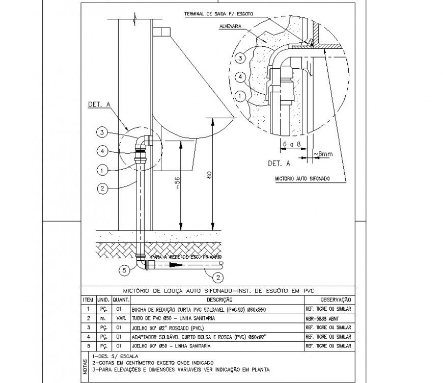 Urinal pipe fittings section autocad file, dimension detail, numbering detail, naming detail, hatching detail, concrete mortar detail, table specification detail, elbow detail, water flow detail, not to scale detail, not to scale detail, etc.