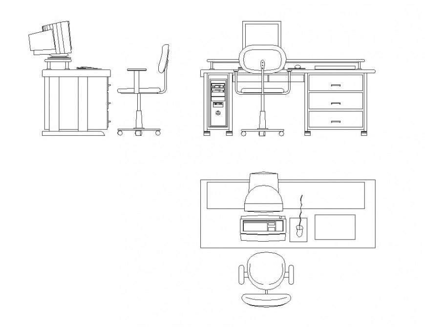 Office table furniture planning autocad file, top elevation detail, front elevation detail, side elevation detail, scrolling chair detail, wooden framing detail, computer detail, mouse detail, key board detail, handle detail, etc.