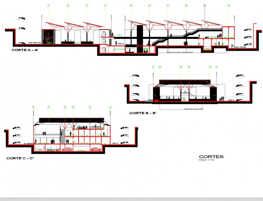 Market commercial plan layout file, people detail, parking detail, furniture detail, stair detail , door window detail, section A-A detail, center line detail, Section line detail, section B-B detail, dimension detail, floor level detail, etc.
