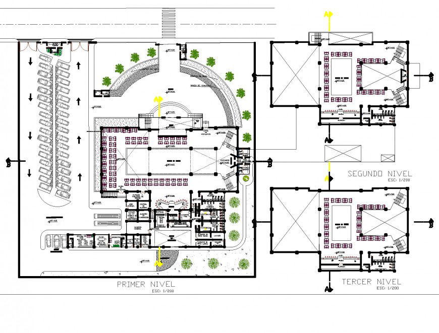Disco club plan autocad file, parking detail, vehicle detail, landscaping detail, dimension detail, naming detail, floor level detail, door window detail, stair detail, section line detail, center line detail, hatching detail, furniture detail, etc.