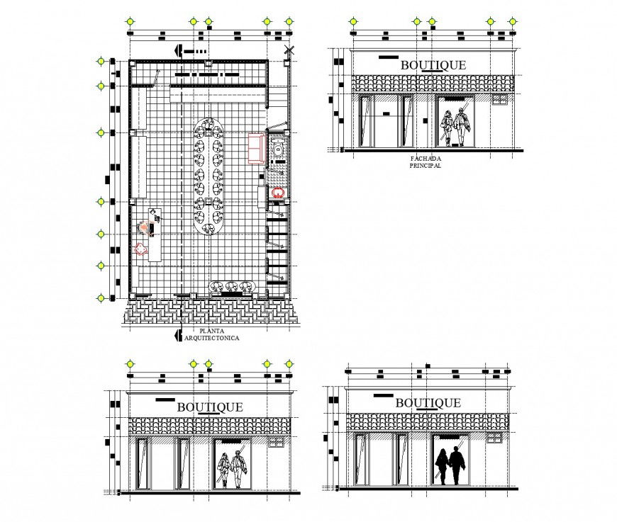 Clothing store layout plan, naming detail, dimension detail, hatching detail, front elevation detail, door window detail, roofing detail, center line detail, section line detail, numbering detail, hatching detail, sanitary detail, etc.