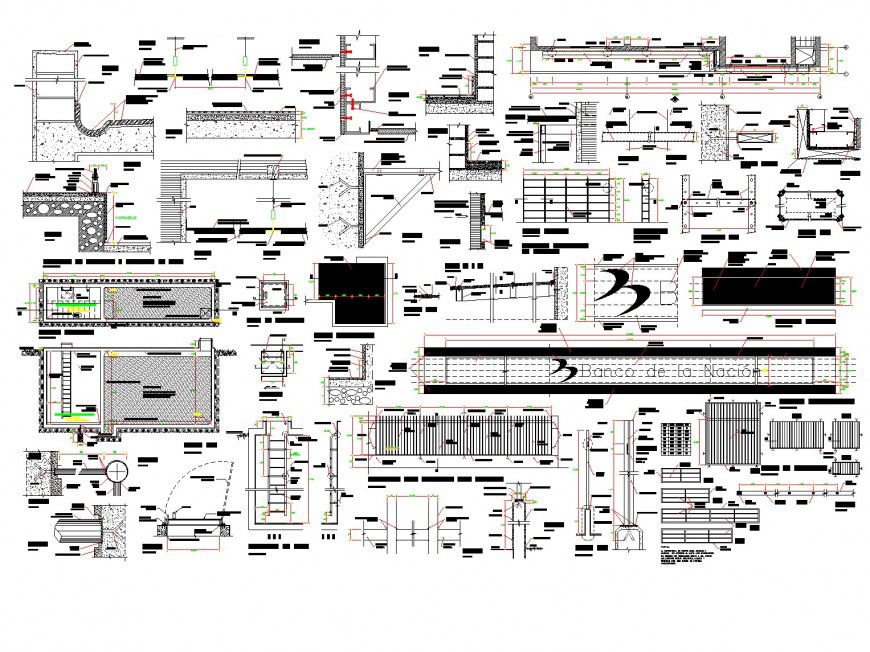 Bank office constructive structure layout file, stirrups detail, reinforcement detail, cut out detail, concrete detail, stone detail, door window detail, section line detail, center line detail, naming detail, dimension detail, cover detail, hatching detail, etc.