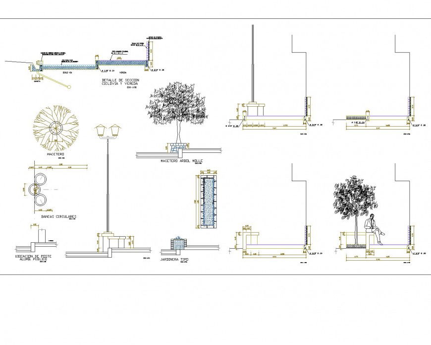 Spark plan detail dwg file, tree elevation detail, street light elevation and section detail, dimension detail, naming detail, hatching detail, landscaping detail in tree and plant detail, concrete mortar detail, etc.