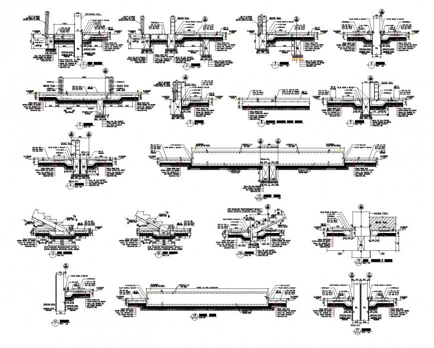Construction building section plan autocad file, stair plan and section detail, centre line detail, dimension detail, naming detail, reinforcement detail, bolt nut detail, cut out detail, hatching detail, beam section detail, etc.
