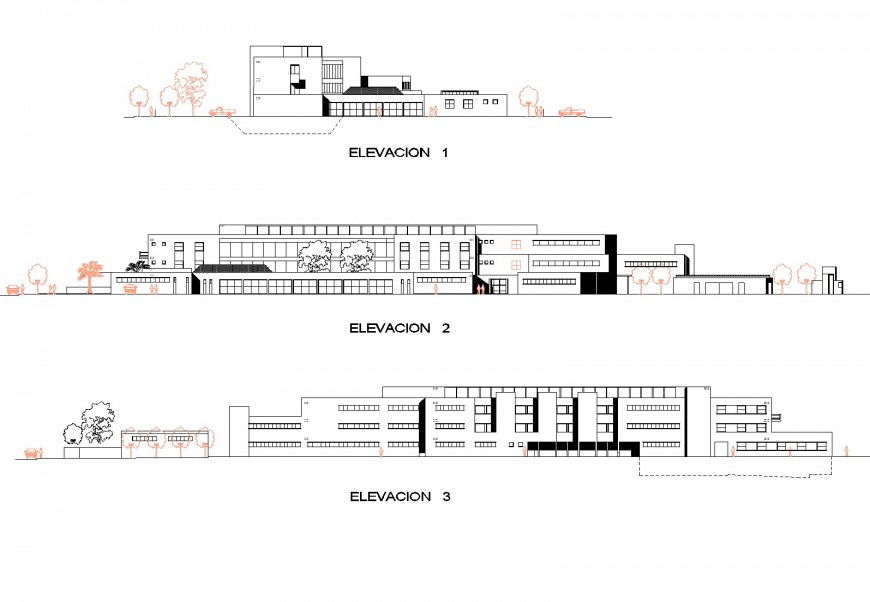 Elevation hospital plan layout file, front elevation detail, right side elevation detail, back elevation detail, landscaping detail in plant and tree detail, furniture detail in door and window detail, etc.