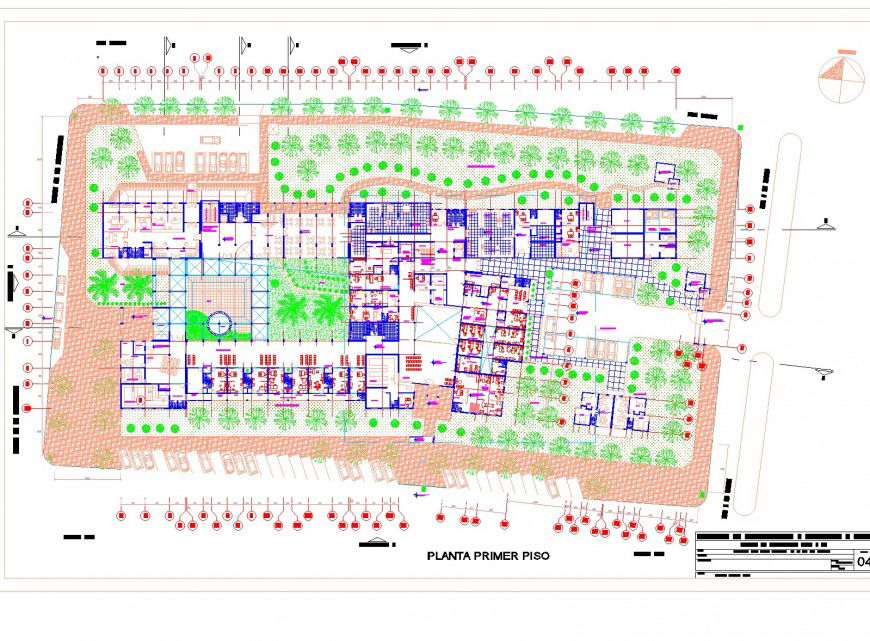 Landscaping hospital plan detail dwg file, section lien detail, centre line detail, landscaping detail in tree and plant detail, cut out detail, toilet detail, car parking detail, north direction detail, furniture detail in door, table, chair, cub board and window detail, etc.