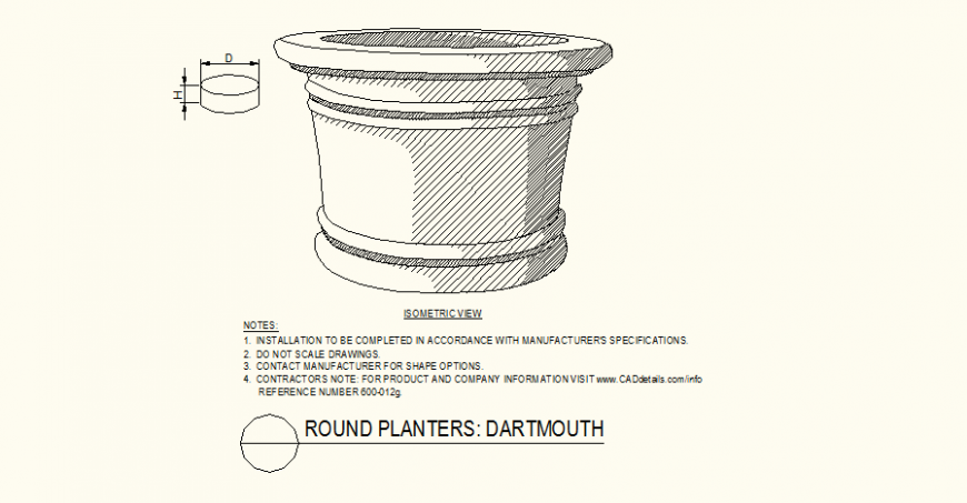 Round planters dartmouth detail layout file, diameter detail, height detail, base detail, hatching detail, isometric view detail, etc.