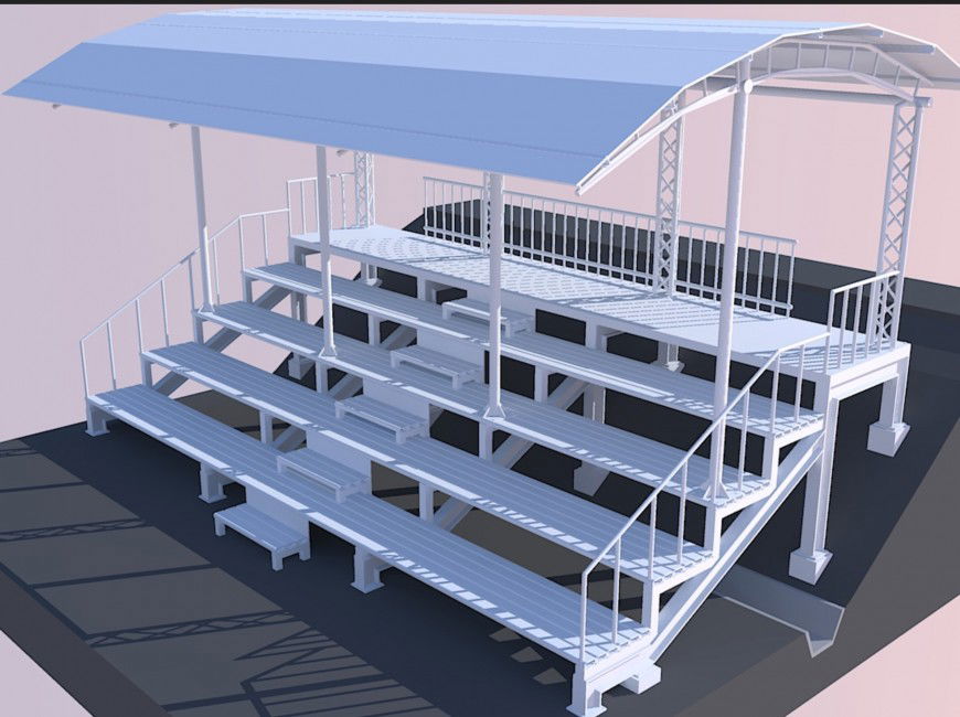 3 d stands plan dwg file, riser and trade detail, steel framing detail, roof section detail, handrail detail, foundation detail, etc