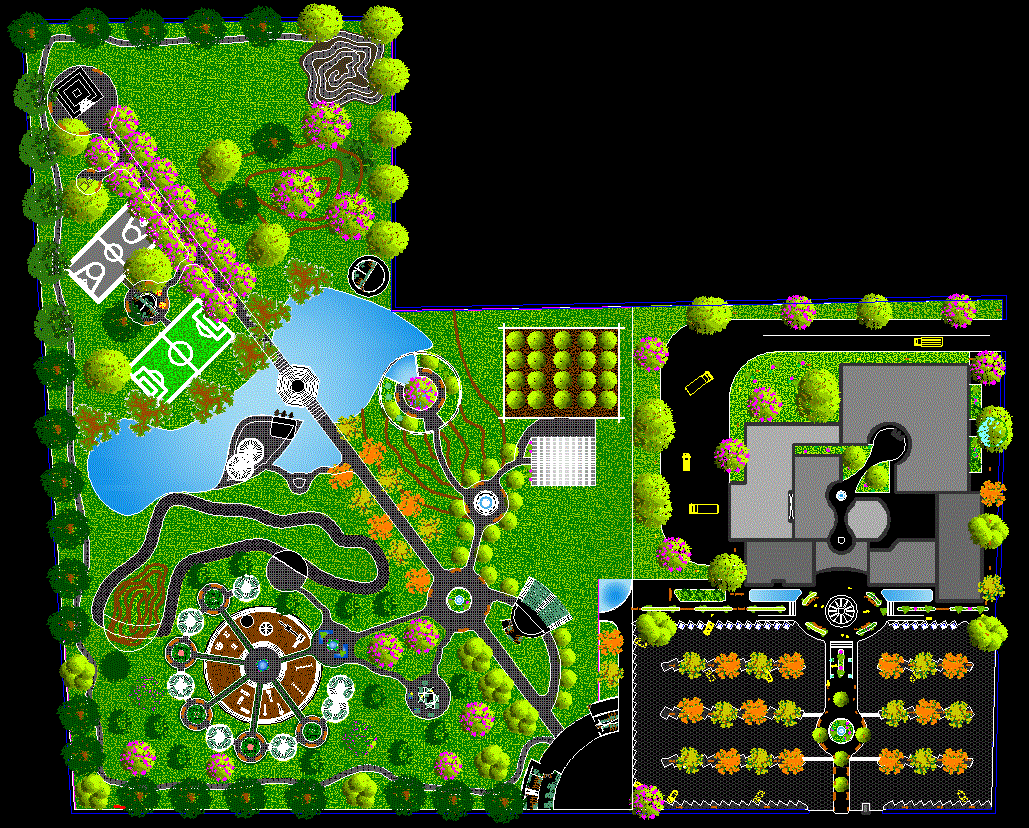 The plan showcases detailed zoning for recreational spaces, green belts, parking areas, and sports courts. It emphasizes balance between aesthetics and functionality, ensuring an eco-friendly and visually Garden landscape design. Each element, from tree placements to pedestrian walkways, is meticulously represented to provide clarity and design flow for real-world application.