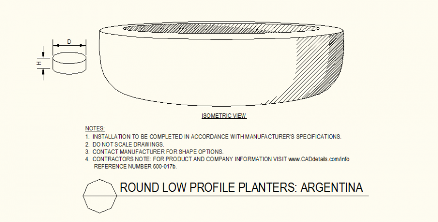 Round shaped planters detail dwg file, isometric view detail, diameter detail, hatching detail, not to scale drawing detail, height detail, etc.