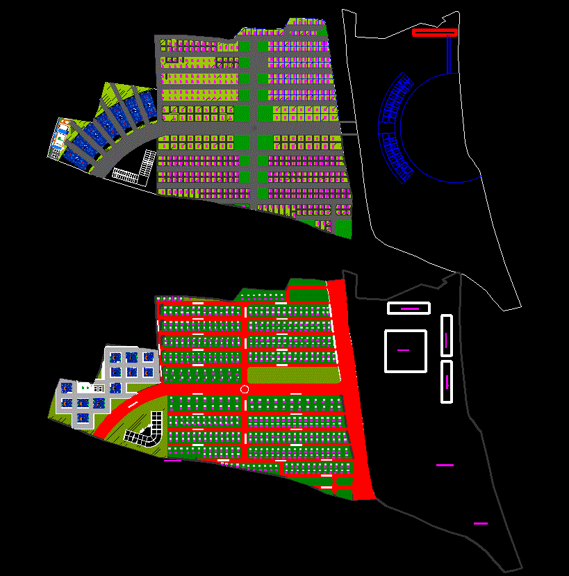 This DWG CAD helps visualize road networks, block divisions, and property arrangements, offering clarity for project approvals, concept presentations, or academic reference. The use of color-coded zones simplifies planning analysis and aids in better understanding the overall spatial structure.