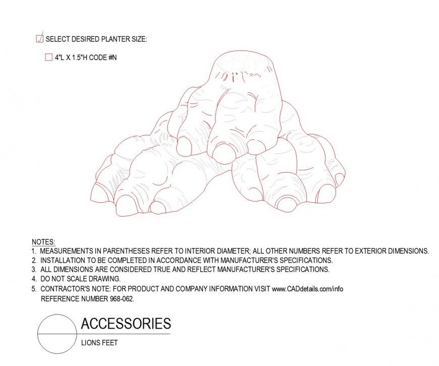 Lions feet accessories layout file, specification detail, naming detail, dimension detail, front elevation detail, etc.
