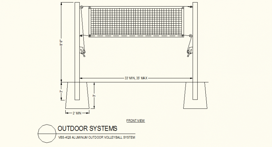 Volleyball court detail plan autocad file, dimension detail, naming detail, hatching detail, front elevation detail, nut bolt detail, etc.