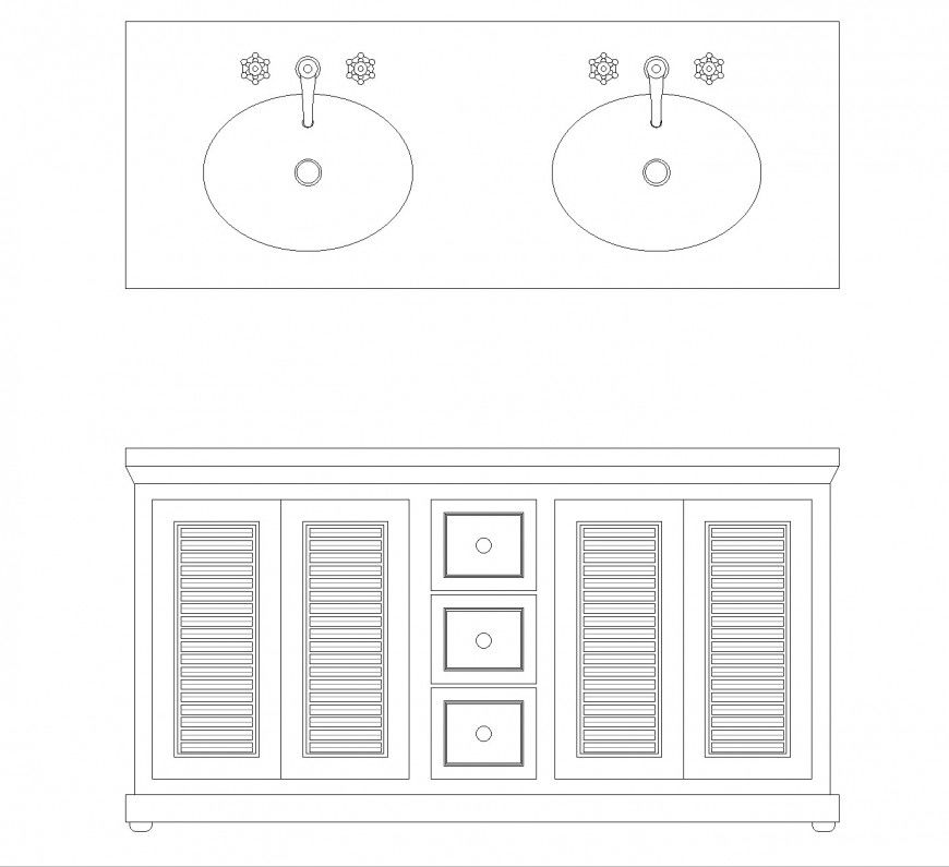 Traditional vanity basin plan autocad file, furniture detail in cub board and drawer detail, trap detail, etc.