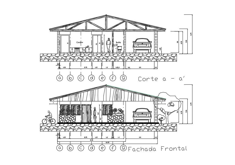 Download Free Small Bungalow Design In AutoCAD File in a layout plan, elevation details hall, kitchen, dining room, parking area, Download Free Small Bungalow Design In AutoCAD File
