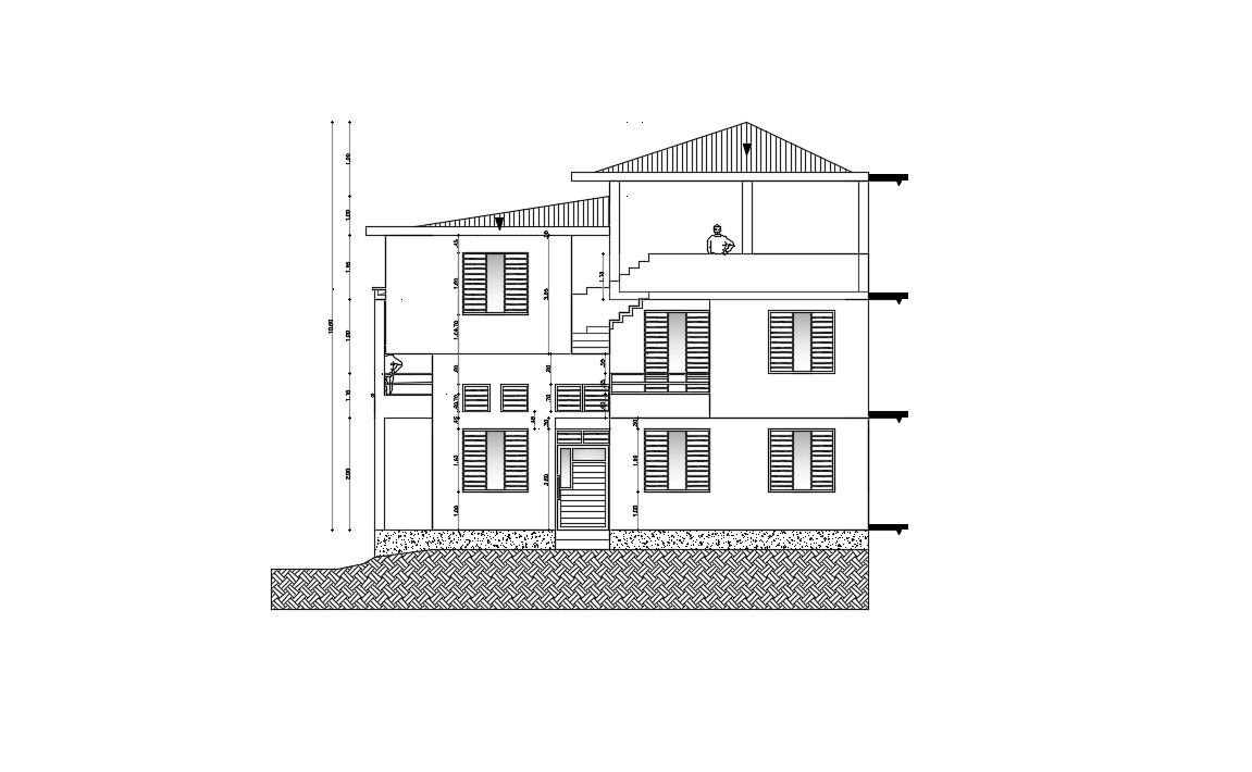 single House elevation details in a ROOM, DINNING ROOM, BEDROOM, COURTYARD OF CLOTHES, dinning room, LATERAL FACADE, 3 Story Building Plan In DWG File