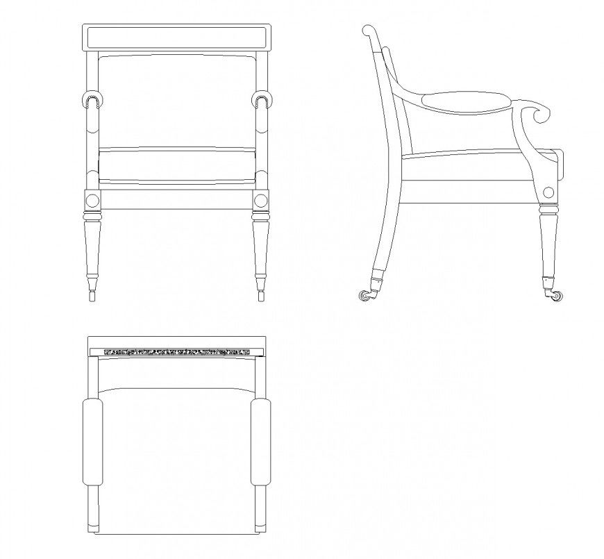 Armchair CAD Block layout file, front elevation detail, side elevation detail, back elevation detail, etc.