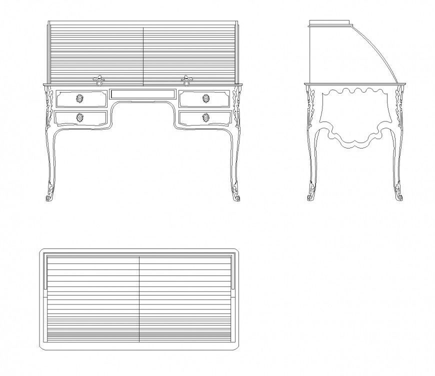 Writing desk CAD block autocad file, furniture detail in drawer detail, front elevation detail, side elevation detail, back elevation detail, etc.