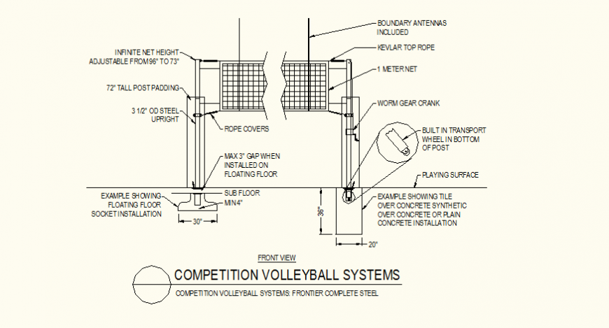 Volleyball court detail elevation dwg file, naming detail, hatching detail, dimension detail, cut out detail, front elevation detail, etc.