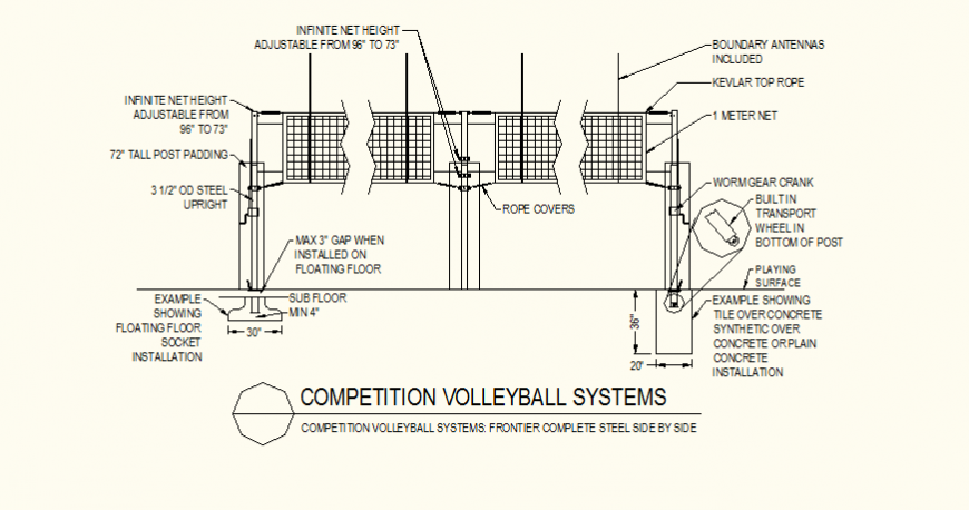 Competition volleyball detail plan dwg file, naming detail, hatching detail, dimension detail, naming detail, hatching detail, playing surface detail, nut bolt detail, front elevation detail, etc.