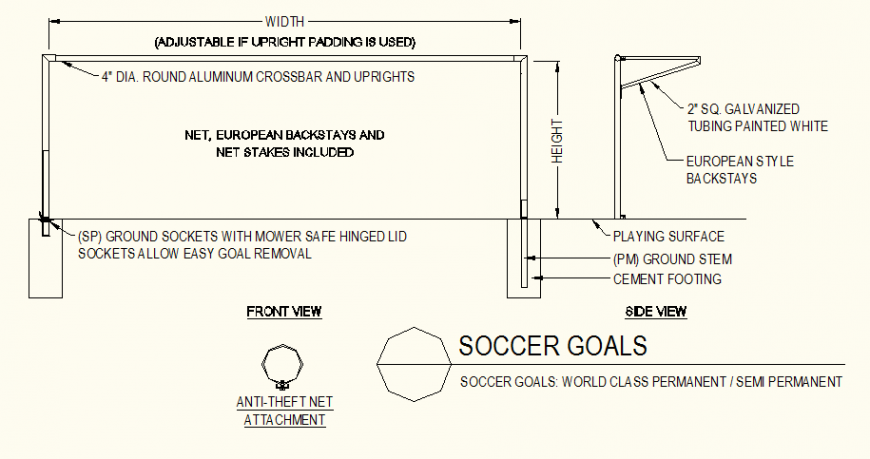 Soccer goal elevation dwg file, naming detail, side elevation detail, dimension detail, height detail, front elevation detail, etc.