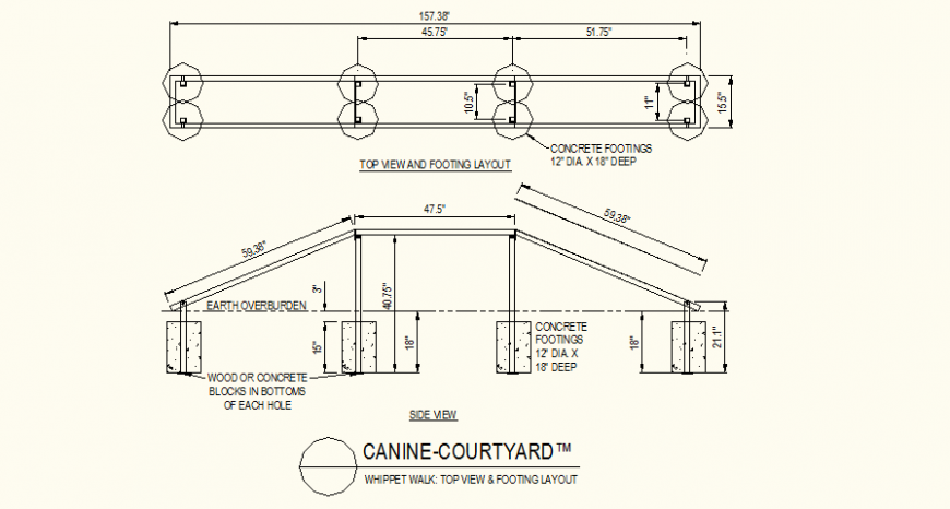 Whippet walk detail plan dwg file, footing layout detail, dimension detail, top view detail, dimension detail, side elevation detail, concreting detail, earth overburden detail, concrete footing detail, etc.