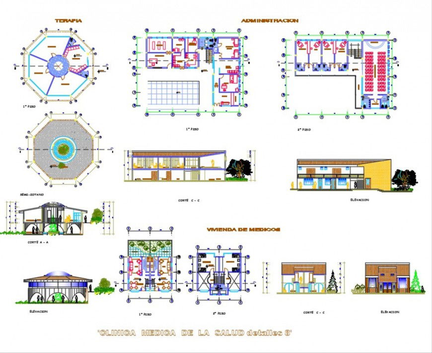 Detail of clinic plan layout file, section A-A’ detail, section B-B’ detail, section C-C’ detail, centre line detail, dimension detail, naming detail, landscaping detail in tree and plant detail, front elevation detail, side elevation detail, section line detail, furniture detail in door, window, table, chair and cub bocrd detail, etc.