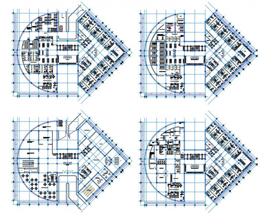Hospital plan dwg file, centre line plan detail, dimension detail, furniture detail in door, window, table, chair and cub board detail, cut out detail, parking detail, etc.