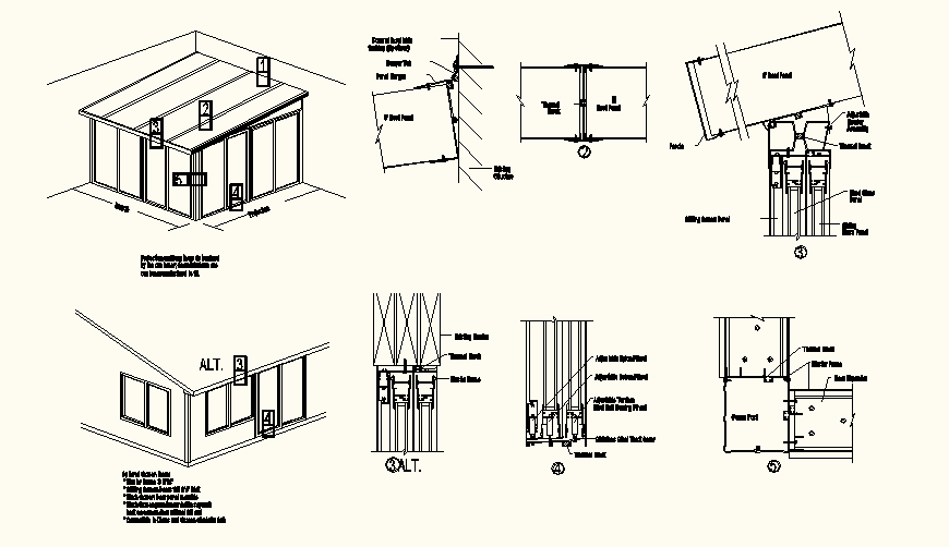 Conservatory Detail elevation autocad file, isometric view detail, naming detail, dimension detail, top view detail, side elevation detail, door window detail, nut bolt detail, angle connection detail, etc.