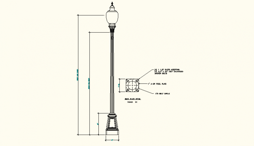 Streetlight detail elevation layout file, front elevation detail, dimension detail, base plate detail, nut bolt detail, naming detail, etc.