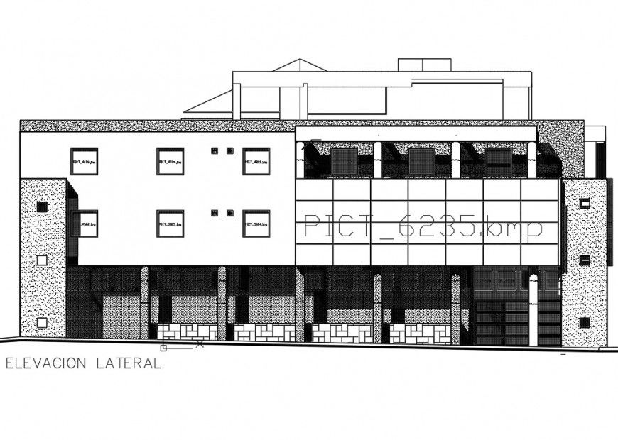 Side elevation house plan dwg file, column detail, hatching detail, brick wall detail, vent detail, glass fiber detail, etc.