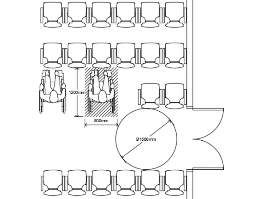 Seating area spacing detail,here there is 2d detailing and top view detail of a seating area with dimension