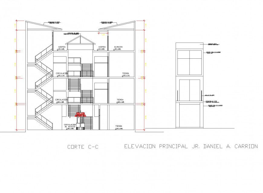 Commercial building detail elevation dwg file, front elevation detail, staircase detail, naming detail, door window detail, floor level detail, dimension detail, etc.